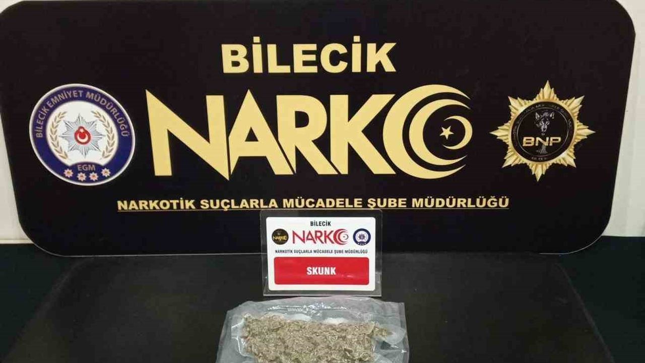 Alınan bilgilere göre; Bilecik İl Emniyet Müdürlüğüne bağlı Narkotik Suçlarla Mücadele Şube Müdürlüğünce yapılan yol kontrollerinde bir sürücünün şüpheli hareketleri sonrası hemen harekete geçti. Narkotik köpeği araçta yaptığı aramada bagaj kısmına geldiğinde o bölüme yoğunlaştı. Açılan bagajda çadır içine saklanmış 220,52 gram 'Skunk' maddesi ele geçirildi. Araçta bulunan 2 kişi gözaltına alınırken, ilk sorguların ardından adliyeye sevk edildi. 1 şahıs mahkemece adli kontrol şartıyla, 1 şahıs savcılık işlemleri akabinde serbest bırakıldı.