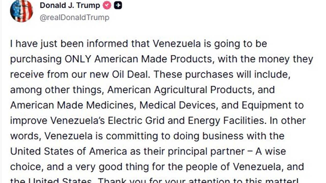 ABD Başkanı Donald Trump, Venezuela'nın kendileri ile yapılacak petrol anlaşmasından elde edeceği gelirle yalnızca Amerikan yapımı ürünleri satın alacağını açıklayarak, 'Venezuela, ana ticari ortak olarak ABD ile iş yapmayı taahhüt ediyor. Bu, akıllıca bir tercih ve hem Venezuela halkı hem de ABD için son derece olumlu bir gelişme' dedi.