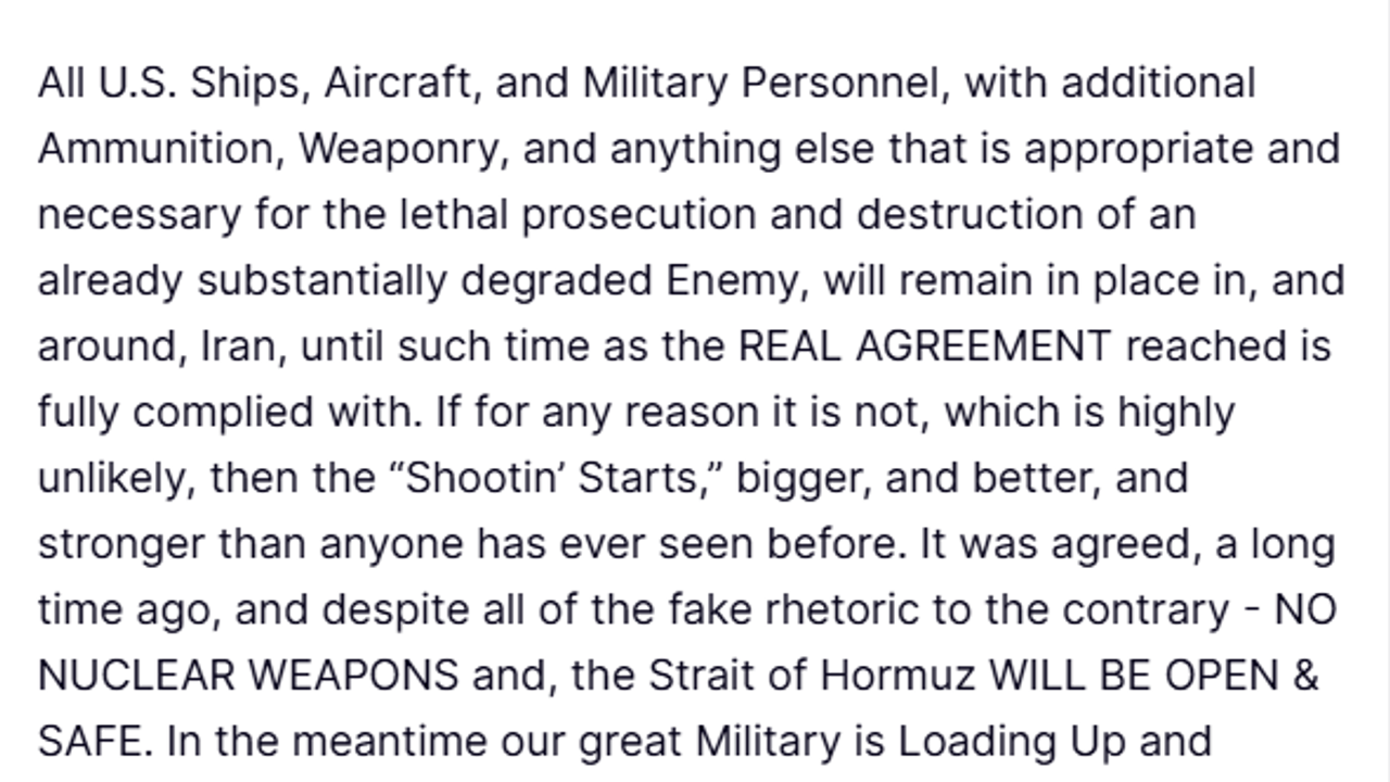 ABD Başkanı Donald Trump, İran'ın varılan anlaşma kapsamındaki yükümlülüklerini yerine getirmemesi halinde, İran'a yönelik saldırıların eskisinden daha güçlü şekilde yeniden başlayacağını belirterek, 'Uzun zaman önce üzerinde anlaşıldı. Ve aksini iddia eden tüm asılsız söylemlere rağmen, nükleer silah olmayacak ve Hürmüz Boğazı açık, güvenli olacak' dedi.