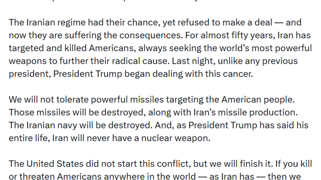 ABD Savunma Bakanı Pete Hegseth, İran'la yaşanan çatışmayı ABD'nin başlatmadığını, ancak ABD'nin bitireceğini belirterek, 'Amerikan halkını hedef alan güçlü füzelere müsamaha göstermeyeceğiz. Bu füzeler, İran'ın füze üretim kapasitesi ile birlikte imha edilecek. İran donanması yok edilecek. Başkan Trump'ın tüm hayatı boyunca söylediği gibi, İran asla nükleer silaha sahip olmayacak' açıklamasında bulundu.