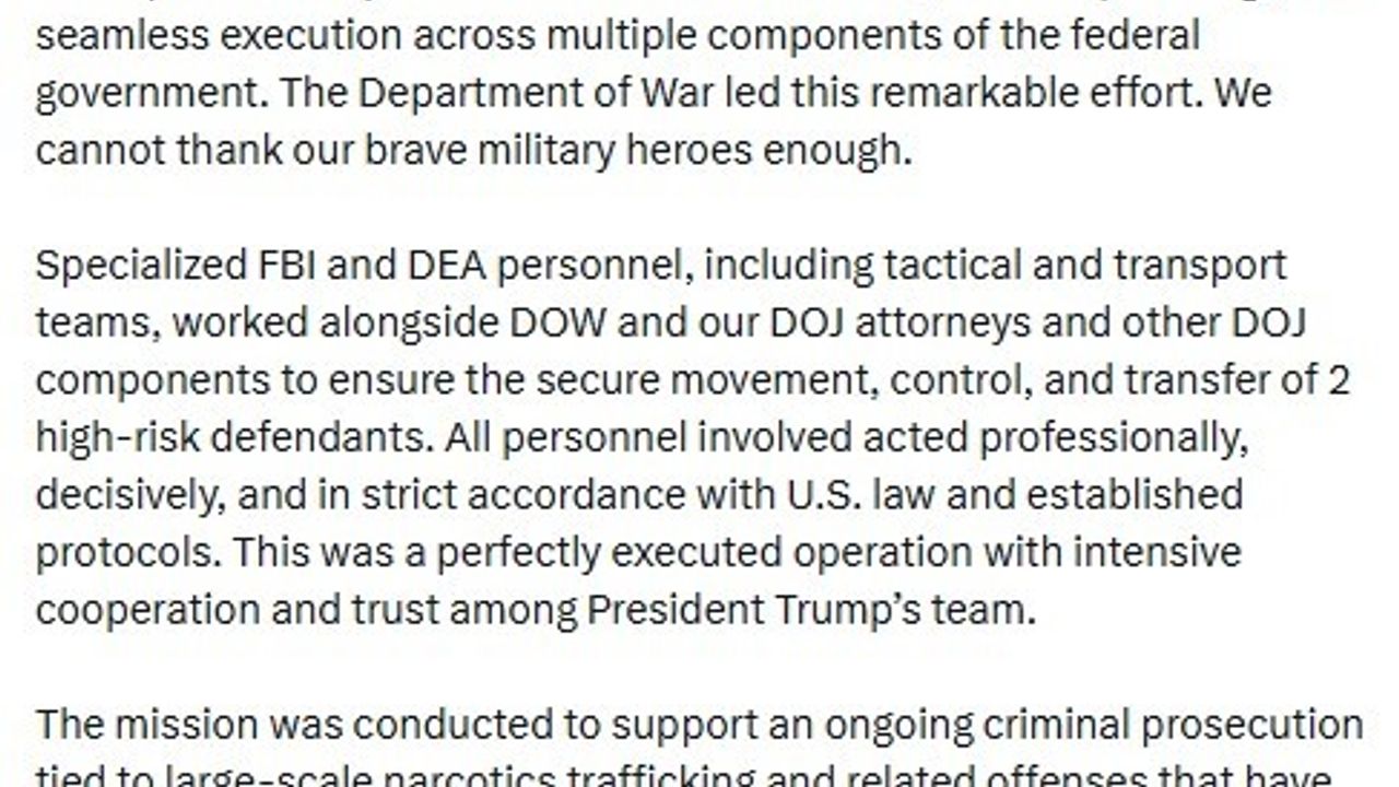 ABD Adalet Bakanlığı (DOJ), Federal Soruşturma Bürosu (FBI) ve Uyuşturucuyla Mücadele Dairesi (DEA), Venezuela Devlet Başkanı Nicolas Maduro ve eşine yönelik operasyon ile ilgili ortak bir açıklama yaptı. ABD Adalet Bakanı Pam Bondi'nin sosyal medya platformu X üzerinden paylaştığı açıklamada, Maduro'yu ABD'de adalete teslim etmeyi amaçlayan karmaşık bir kolluk görevinin başarıyla tamamlandığı vurgulanarak, 'Bu operasyon, federal hükümetin birçok birimi arasında aylarca süren bir koordinasyon, ayrıntılı bir planlama ve kusursuz bir uygulama gerektirdi. ABD Savunma Bakanlığı bu olağanüstü çabaya öncülük etti. Cesur ve kahraman askeri personelimize ne kadar teşekkür etsek azdır' ifadeleri kullanıldı.