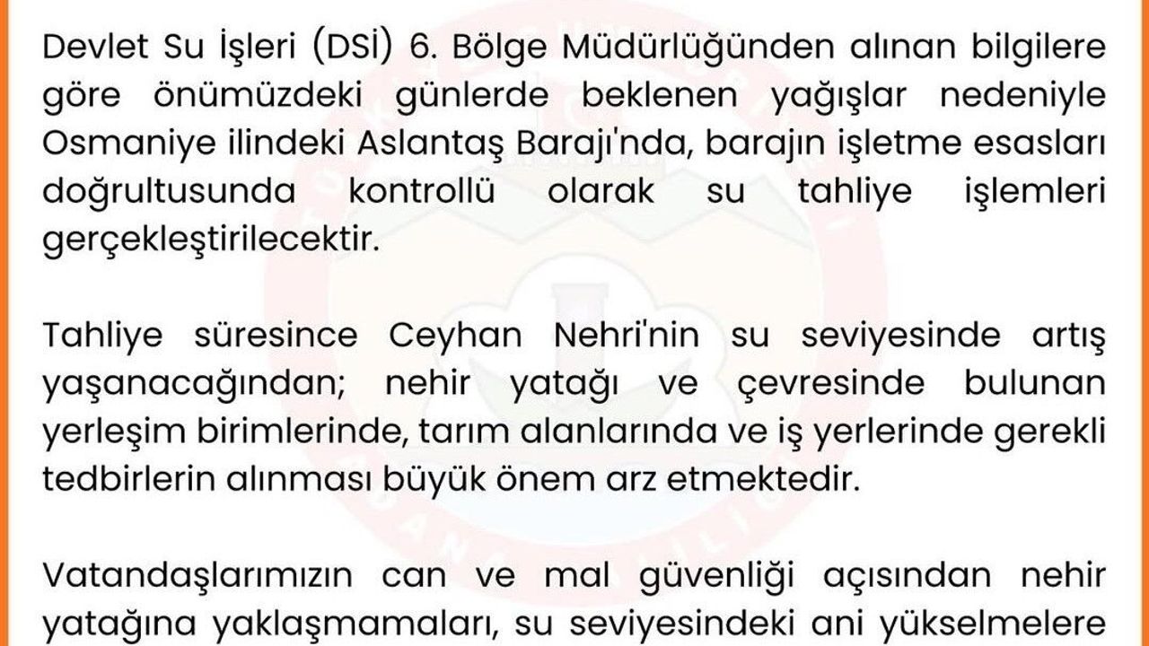 Adana Valiliği, Devlet Su İşleri (DSİ) 6. Bölge Müdürlüğü'nün önümüzdeki günlerde beklenen yağışlar nedeniyle Osmaniye'deki Aslantaş Barajı'nda kontrollü su tahliyesi yapacağını, Ceyhan Nehri'nde su taşkınları olabileceğini duyurdu.
