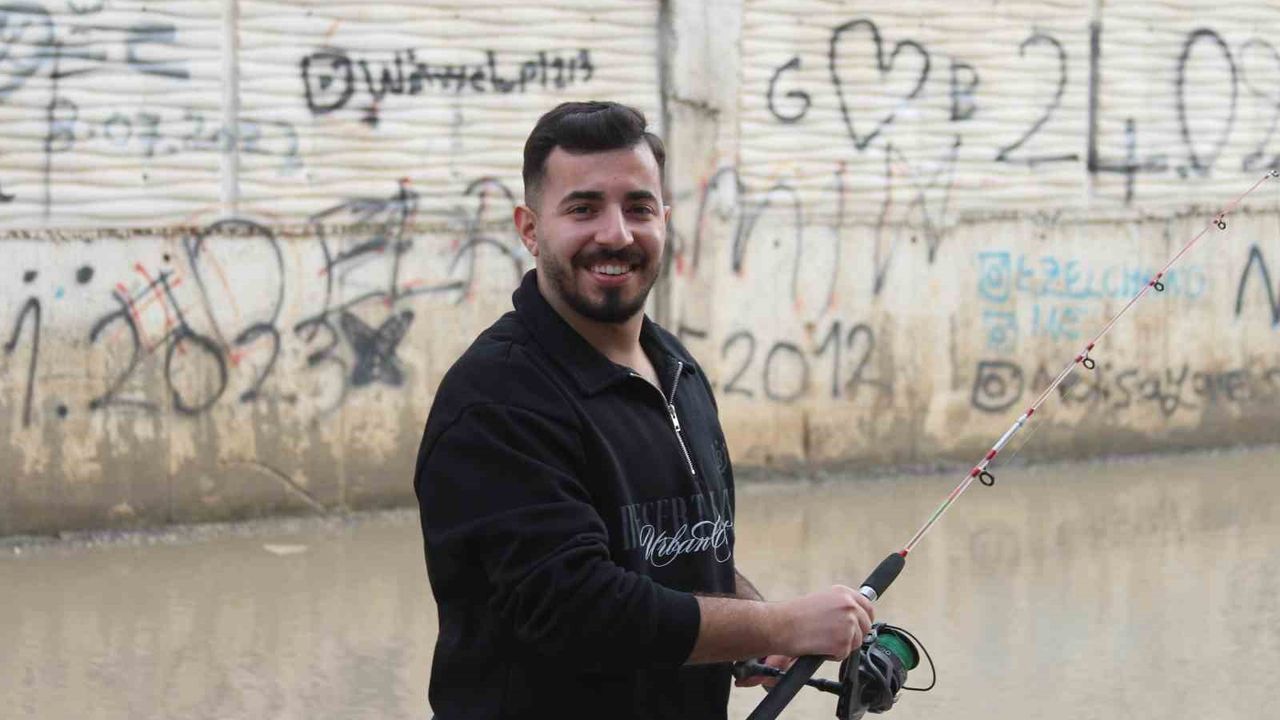 Adana'da yağmur sonrası göle dönen bir sokakta esnaflık yapan genç altyapı sorununa dikkat çekmek için su birikintisine olta attı.
