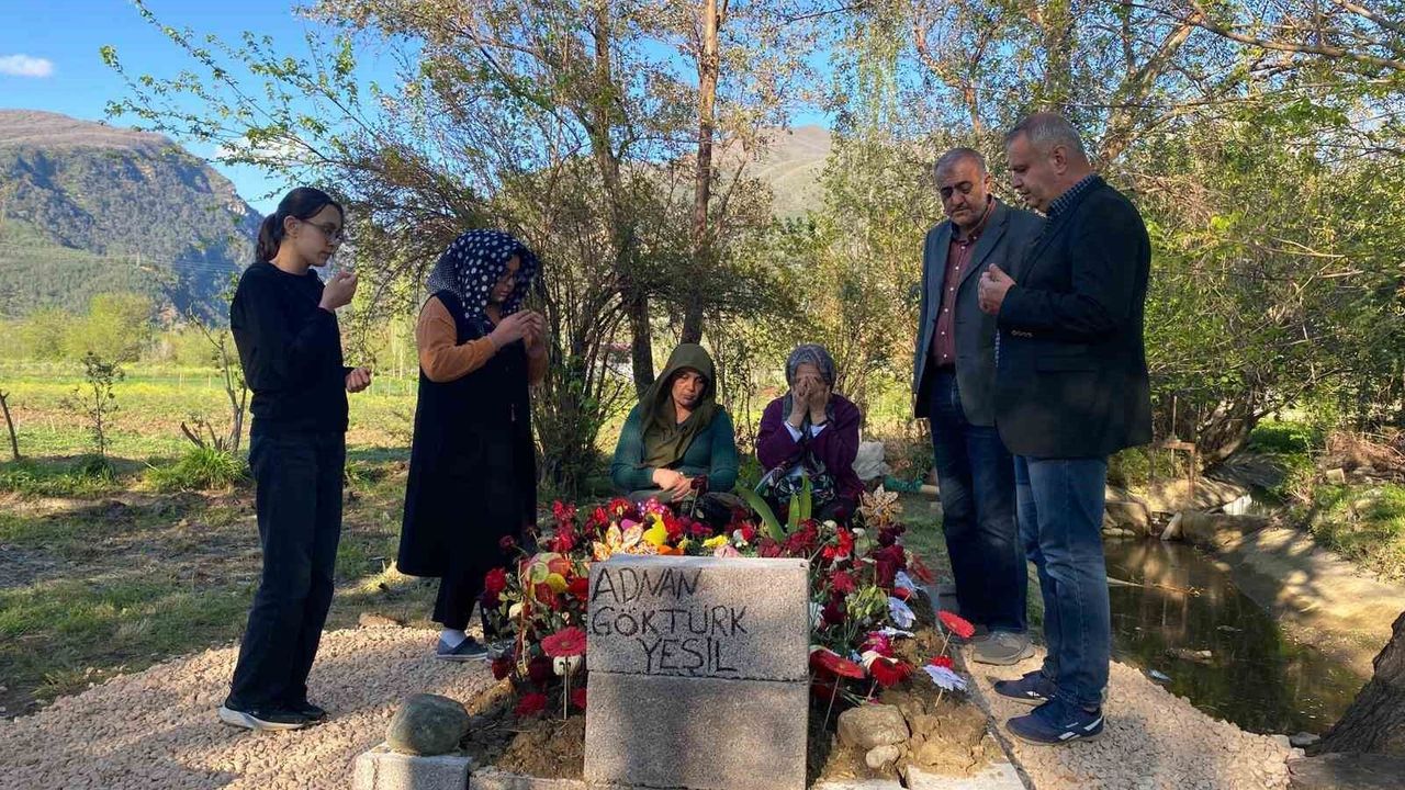 Düziçi ilçesindeki Yeşil Mezarlığı'nda bulunan Adnan'ın kabrini ziyaret eden ailesi, arkadaşları ve vatandaşlar çiçekler bırakıp dualar ediyor.