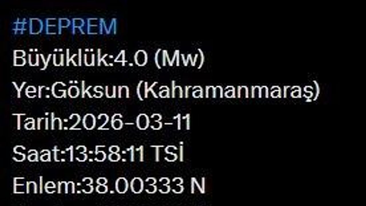 AFAD'ın paylaştığı bilgilere göre, Kahramanmaraş'ın Göksun ilçesinde saat 13.58'de 4.0 büyüklüğünde deprem meydana geldi. Merkezi Göksun olan depremin derinliği 7 kilometre olarak ölçüldü.