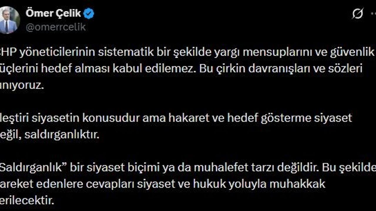 AK Parti Sözcüsü Ömer Çelik, 'CHP yöneticilerinin sistematik bir şekilde yargı mensuplarını ve güvenlik güçlerini hedef alması kabul edilemez. Bu çirkin davranışları ve sözleri kınıyoruz. Eleştiri siyasetin konusudur ama hakaret ve hedef gösterme siyaset değil, saldırganlıktır' dedi.