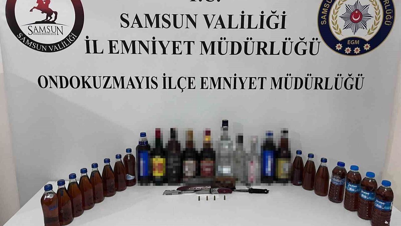Samsun'un 19 Mayıs ilçesinde yapılan denetimde 1.64 promil alkollü olduğu belirlenen sürücünün aracından şişeler içinde el yapımı sahte içki, bıçak ve fişek ele geçirildi.