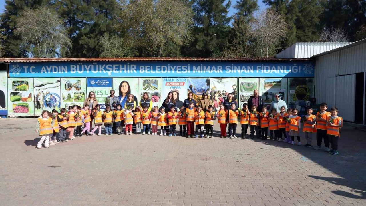 Cumhuriyet İlkokulu anasınıfı öğrencileri ve öğretmenleri, derslerini Aydın Büyükşehir Belediyesi'nin Mimar Sinan Mahallesi'ndeki fidanlığında işledi.