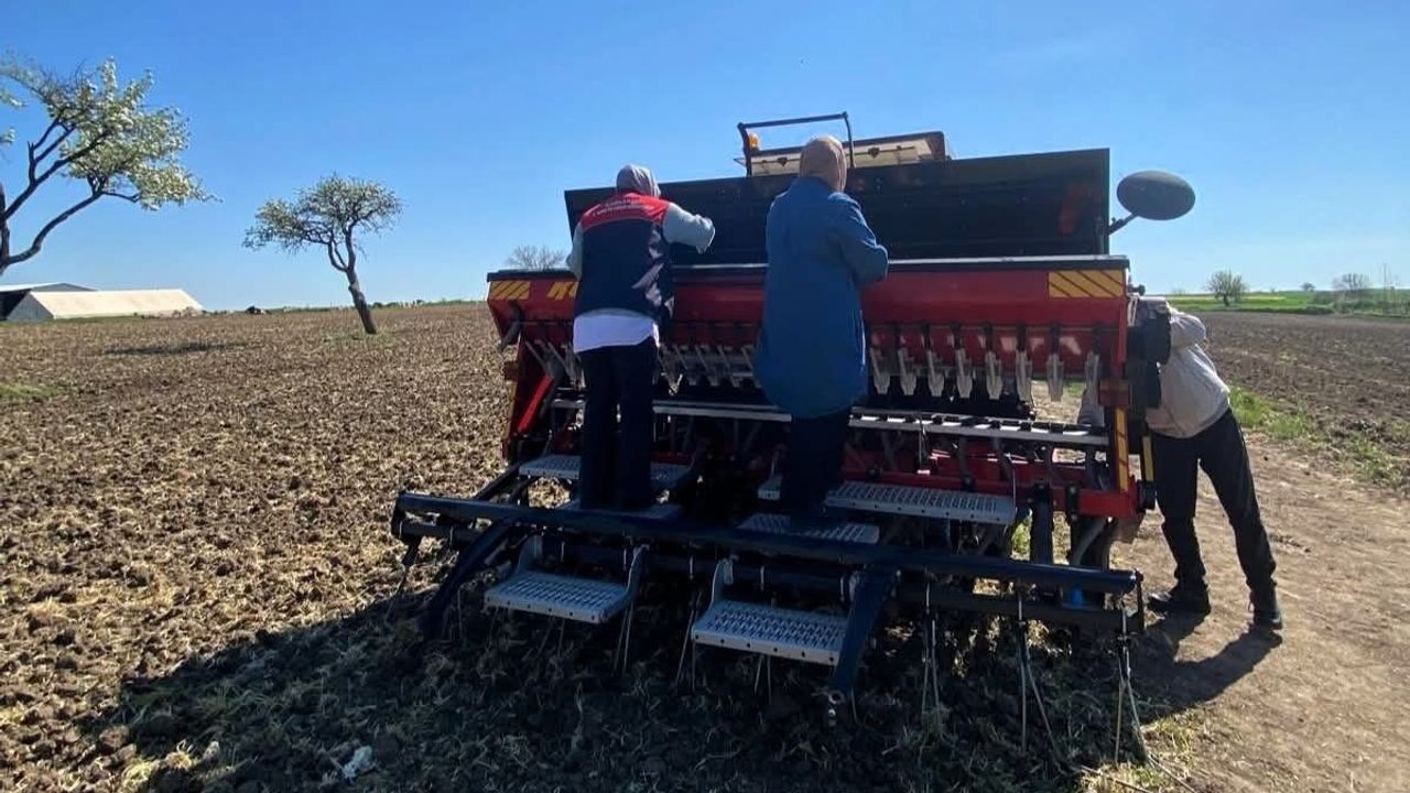 Kırklareli'nin Babaeski ilçesi Kadıköy köyünde ekim çalışmalarında aspir tohumları toprakla buluşturuldu.