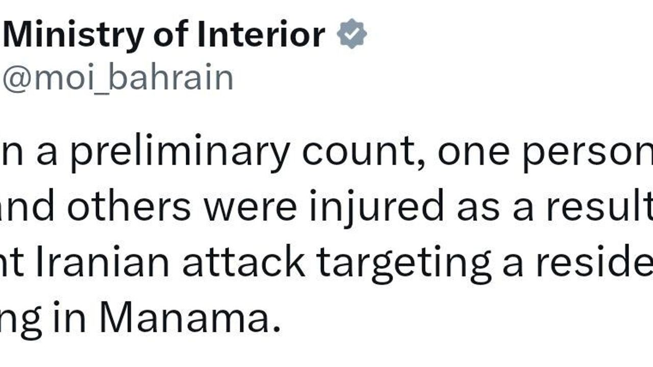 Bahreyn İçişleri Bakanlığı, ülkenin başkenti Manama'daki sivil bir binayı hedef alan İran saldırısında 1 kişinin hayatını kaybettiğini ve yaralananların olduğunu açıkladı.
