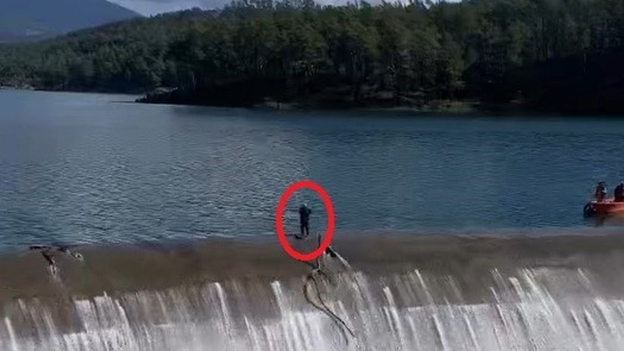 Kumluca ilçesine bağlı Çayiçi Mahallesi sınırları içinde bulunan Alakır Barajı'nda alabalık üreten Nuri Yurtseven, dolu savakta takılan çalı ve ağaçları önce tekne ile ardından yürüyerek gidip temizledi. Suyun döküldüğü alanda temizlik yapan Yurtseven'i görenlerin yüreği ağzına geldi. Vatandaşlar o anları cep telefonlarıyla görüntüledi.