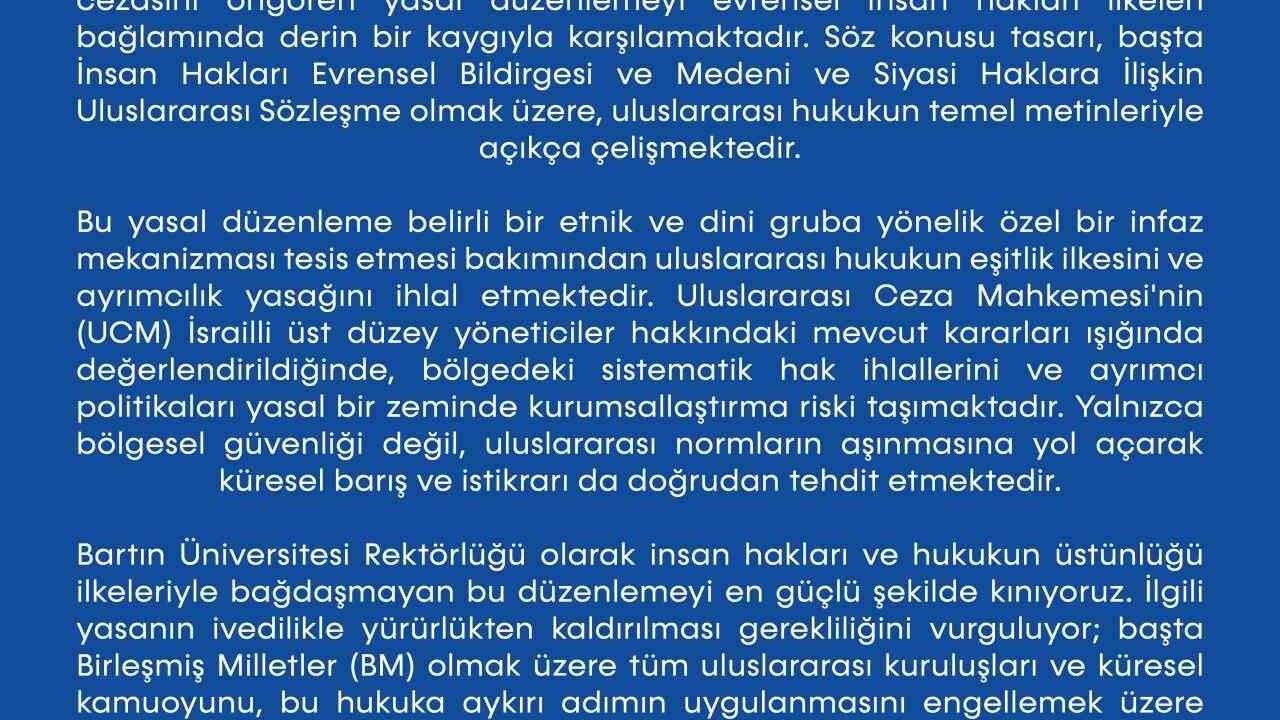 Açıklamada, 'Bartın Üniversitesi (BARÜ) Rektörlüğü, İsrail tarafından Filistinlilere yönelik idam cezasını öngören yasal düzenlemeyi evrensel insan hakları ilkeleri bağlamında derin bir kaygıyla karşılamaktadır. Söz konusu tasarı, başta İnsan Hakları Evrensel Bildirgesi ve Medeni ve Siyasi Haklara İlişkin Uluslararası Sözleşme olmak üzere, uluslararası hukukun temel metinleriyle açıkça çelişmektedir.