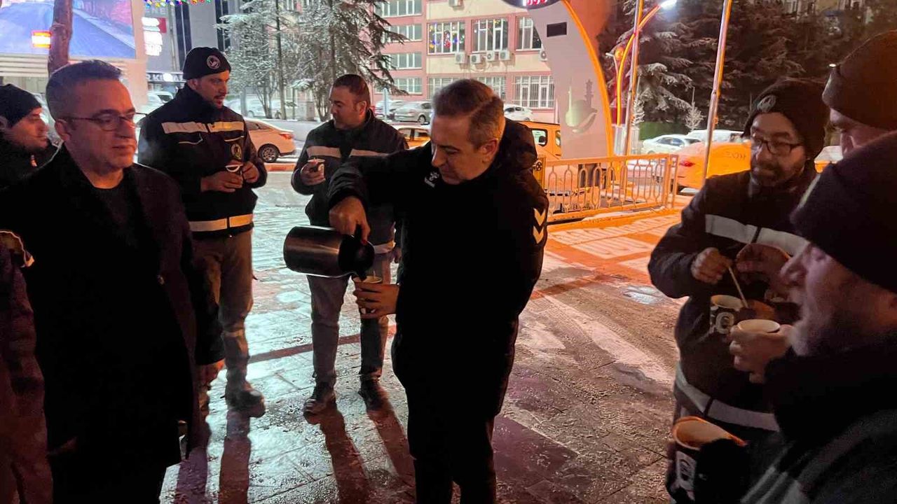 Sungurlu Belediye Başkanı Muhsin Dere, karla mücadele eden personele kahve ikram etti.