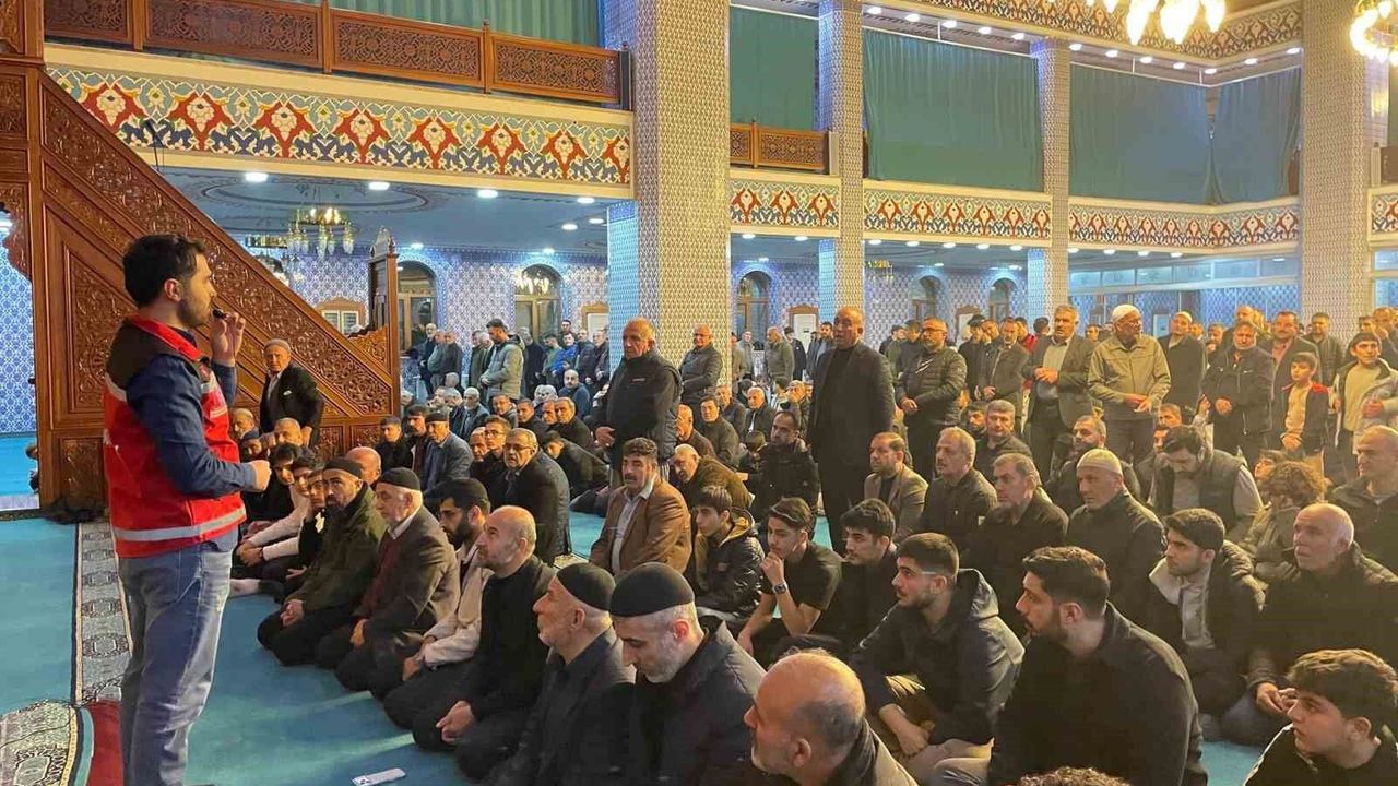 Batman'da Ramazan ayı dolayısıyla teravih namazına giden vatandaşlar kürsüde bağımlılık ile mücadele ekiplerini dinledi.