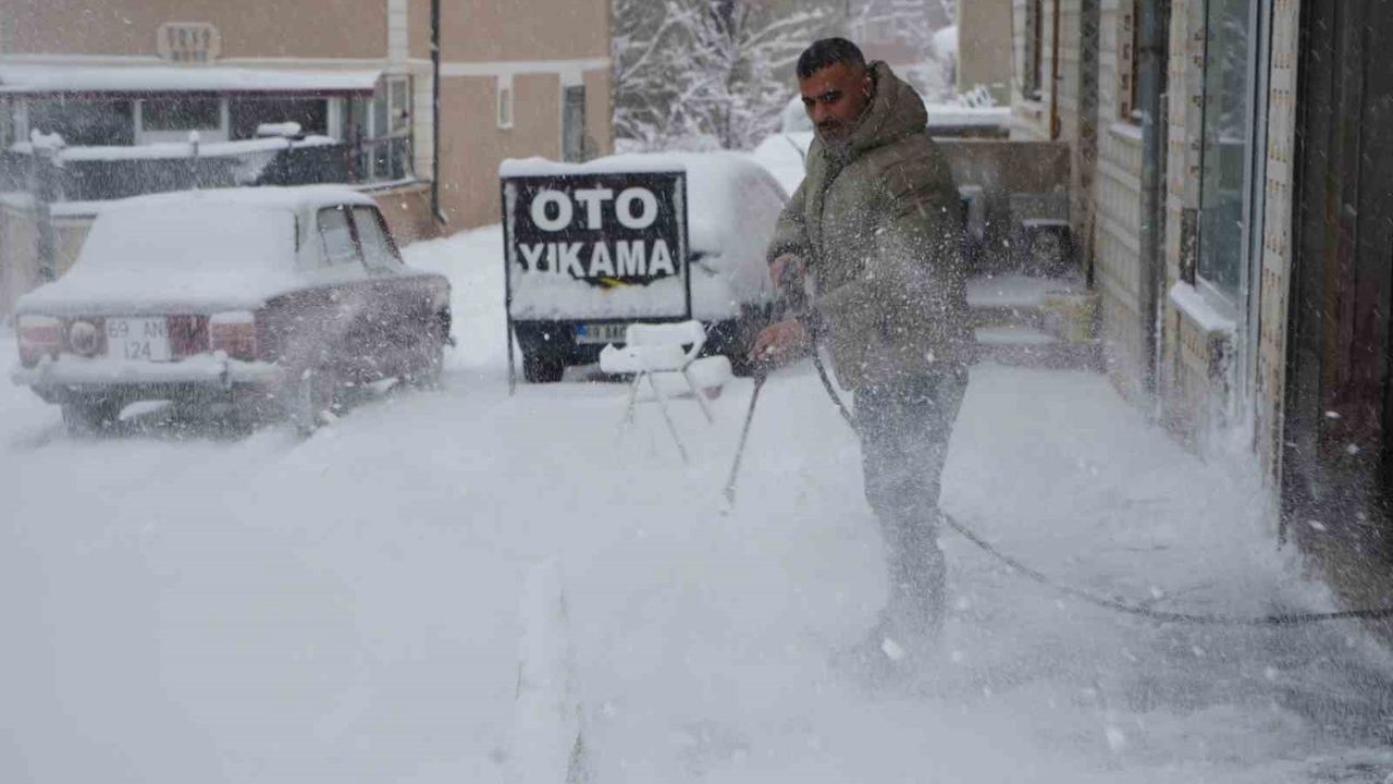 Bayburt'ta aralıksız devam eden kar yağışıyla kentte kar kalınlığı yer yer 10 santimetreye ulaştı. Yoğun kar nedeniyle vatandaşlar iş yerlerinin önünü kürek ve süpürgeyle temizlerken, oto yıkamacı İsa Karahan ise farklı bir yol izledi.
