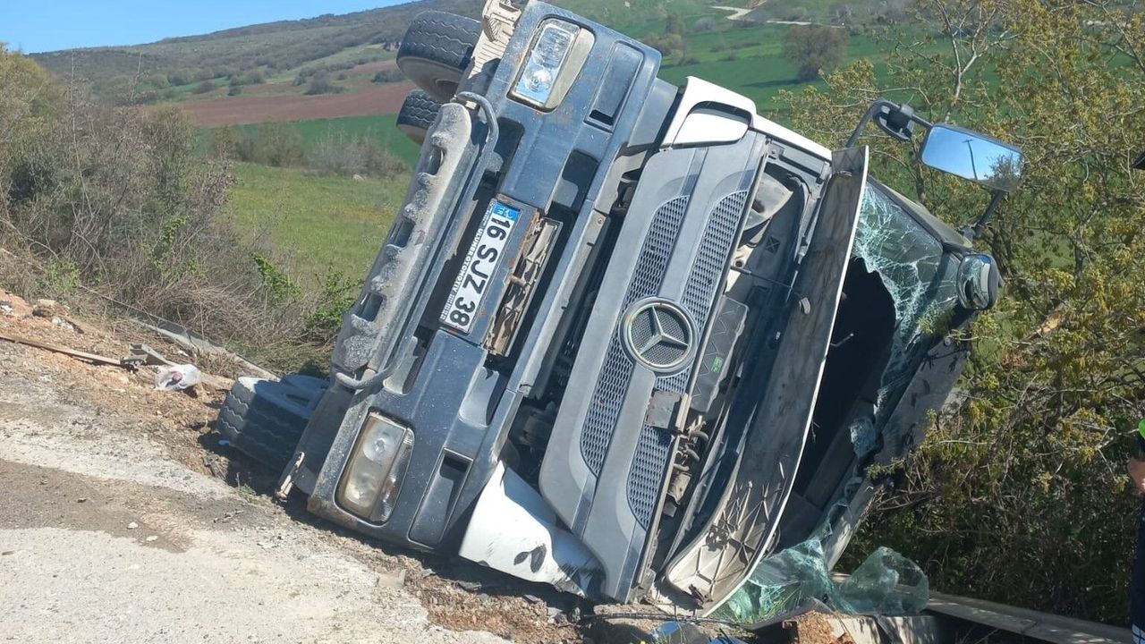 Bursa'nın İnegöl ilçesinde meydana gelen kazada kontrolden çıkan beton mikseri şarampole yuvarlandı.