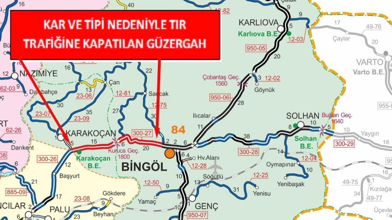 Bingöl Valiliği'nden yapılan açıklamada, 'Bingöl-Elazığ Devlet Yolunun 0-51 km'leri arası (Bingöl Sancak kavşağı ile Karakoçan ayrım kavşağı arası) yoğun kar yağışı ve tipi nedeniyle saat 19.50 itibarıyla TIR trafiğine kapatılmıştır' denildi.