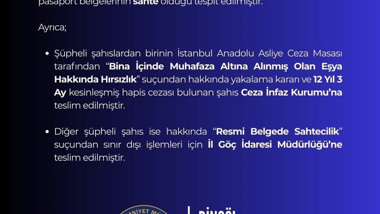Edinilen bilgiye göre, Bingöl İl Emniyet Müdürlüğü ekipleri, göçmen kaçakçılığıyla mücadele kapsamında çalışma yaptı. Çalışmada, Muş-Elazığ istikameti üzerinde durdurulan otobüs içerisinde İran pasaport hamili 2 şahsın pasaport belgelerinin sahte olduğu tespit edildi. Ayrıca şüpheli şahıslardan birinin 'Bina İçinde Muhafaza Altına Alınmış Olan Eşya Hakkında Hırsızlık' suçundan hakkında yakalama kararı ve 12 yıl 3 ay kesinleşmiş hapis cezası bulunduğu öğrenildi.