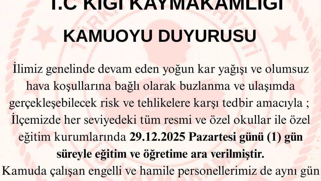 Kiğı Kaymakamlığı ve Adaklı Kaymakamlığı tarafından yapılan açıklamada, devam eden yoğun kar yağışı, buzlanma ve ulaşımda yaşanabilecek riskler nedeniyle tedbir amaçlı karar alındığı aktarıldı. Buna göre, 29 Aralık 2025 Pazartesi günü ilçelerdeki her seviyedeki tüm resmi ve özel okullar ile özel eğitim kurumlarında eğitim ve öğretime 1 gün süreyle ara verildiği bildirildi.