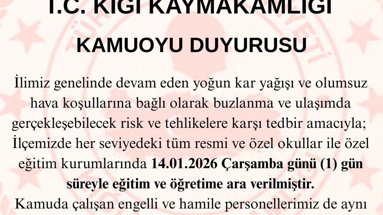 Bingöl'de kar yağışı etkisini sürdürüyor. Bu çerçevede Kiğı, Karlıova ve Adaklı kaymakamlıkları tarafından yapılan açıklamalarda, devam eden kar yağışı, buzlanma ve ulaşımda yaşanabilecek olumsuzluklar göz önünde bulundurularak, 14 Ocak 2026 Çarşamba günü ilçeler genelindeki resmi ve özel tüm eğitim kurumlarında eğitim ve öğretime 1 gün süreyle ara verildiği duyuruldu.