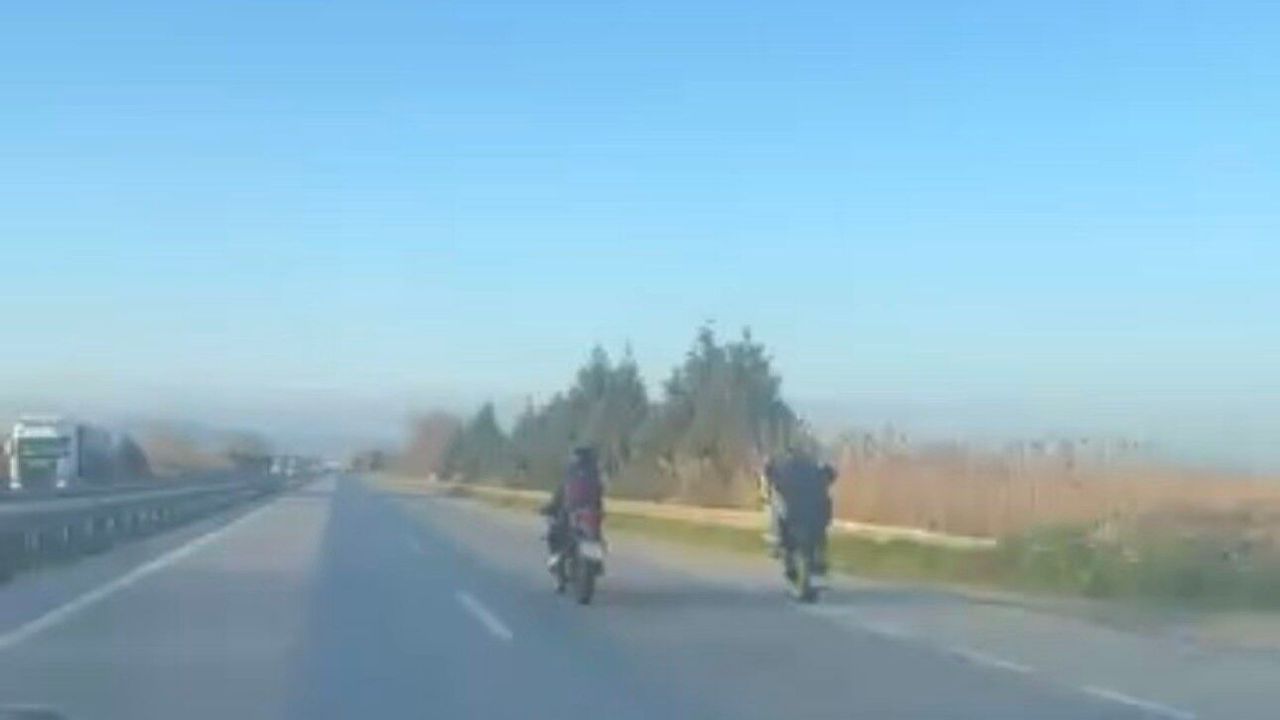 Bursa'nın Mustafakemalpaşa ilçesinde ana yol üzerinde seyir halinde olan iki motosiklet sürücüsü, yaptıkları tehlikeli hareketlerle hem kendi canlarını hem de trafikteki diğer sürücülerin güvenliğini tehlikeye attı.