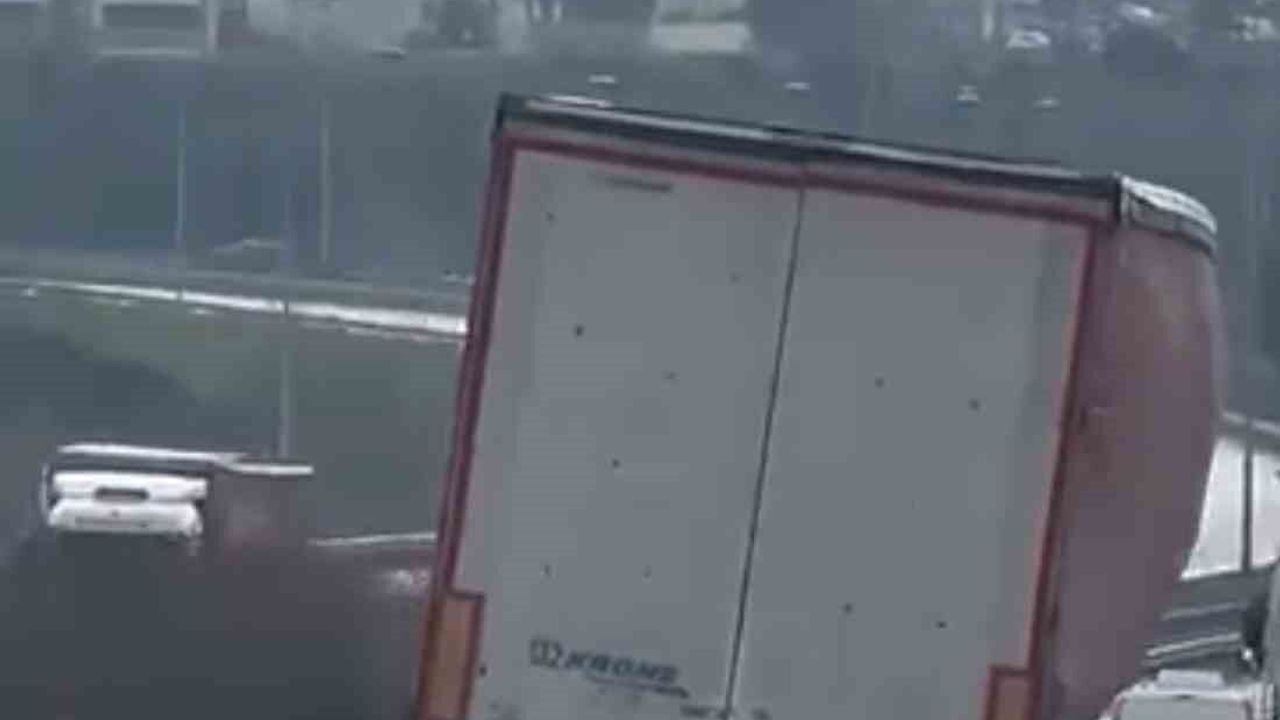 Bursa'da seyir halindeki bir tırın yolda yan şekilde ilerlemesi trafikte tehlikeli anlara neden oldu. Zaman zaman devrilme tehlikesi geçiren tır, çevredeki sürücülere korku dolu anlar yaşattı.