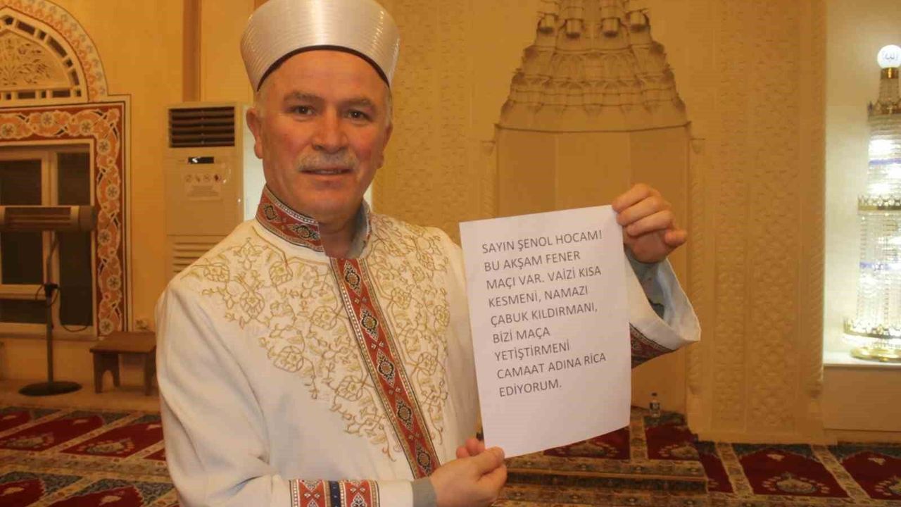 Görele ilçesi Kumyalı Mahallesi'ndeki Şehitlik Camii İmamı Şenol Yılmaz için geçtiğimiz pazartesi akşamı teravih namazı öncesinde minbere 'Bu akşam Fener maçı var. Vaizi kısa kesmeni, namazı çabuk kıldırmanı, bizi maça yetiştirmeni rica ediyoruz' yazılı bir not bırakıldı. Namaz öncesi vaaz vermek üzere kürsüye çıktığında notla karşılaştığını belirten İmam Şenol Yılmaz, o akşam oynanacak Fenerbahçe-Kasımpaşa maçından haberi olmadığını söyledi. Gençlerin talebini 'masum bir istek' olarak değerlendirdiğini ifade eden Yılmaz, cami cemaatinin büyük bölümünü gençlerin oluşturduğunu kaydetti. Yılmaz, 'Genç kardeşlerimiz 'Allah rızası için hocam, bu akşam vaazı kısa tut, namazı hızlı kıldır, bizi maça yetiştir' diye not bırakmışlar. Uzun yıllara dayalı bir gönül bağımız var. Cami dersleri, gençlik, spor ve kültürel faaliyetlerde birlikteyiz. Bu nedenle taleplerine kayıtsız kalmadık' dedi.