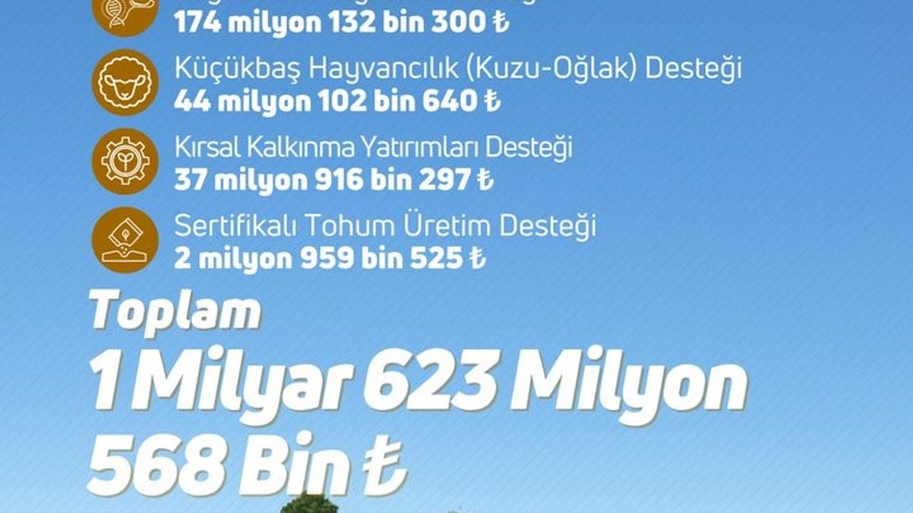Çiftçilere, 1 milyar 364 milyon 458 bin 238 lira arıcılık desteği, 174 milyon 132 bin 300 lira hayvan gen kaynakları desteği, 44 milyon 102 bin 300 lira küçükbaş hayvancılık desteği, 37 milyon 916 bin 297 lira kırsal kalkınma yatırımları desteği, 2 milyon 959 bin 525 lira sertifikalı tohum üretim desteği olmak üzere toplam 1 milyar 623 milyon lira tarımsal destek ödemesi yapıldı. Konuya ilişkin sosyal medya hesabından paylaşım yapan Bakan Yumaklı, 'Üreticimizin emeğine güç katıyor, sürdürülebilir üretim için desteklerimizi aralıksız sürdürüyoruz. 1 milyar 623 milyon TL tarımsal destek ödemesi bugün çiftçilerimizin hesaplarına aktarılıyor. Hayırlı ve bereketli olsun' ifadelerine yer verdi.