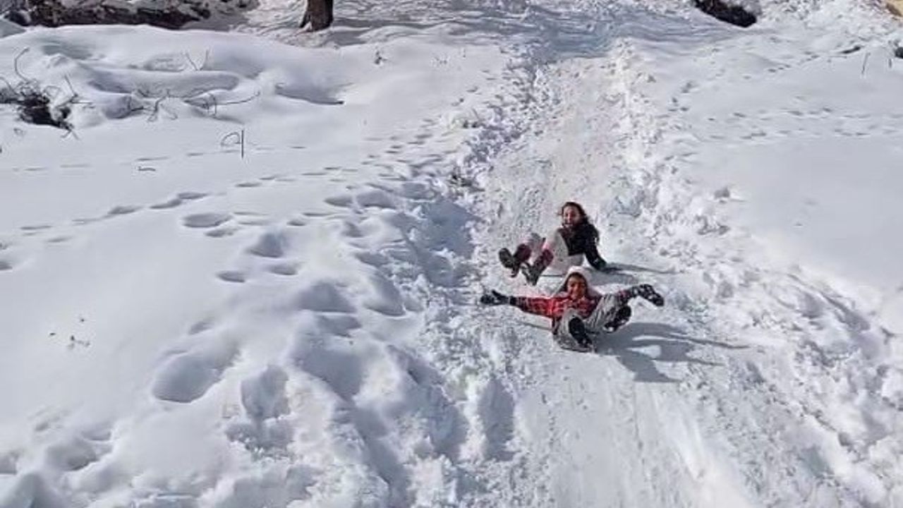 Yazıhan ilçesinde kar kalınlığının yer yer yarım metreyi bulmasıyla birlikte ilçeye bağlı Böğürtlen Mahallesi'nde karı fırsata çeviren çocuklar, soğuk havaya aldırış etmeden tepsi ve bidon gibi buldukları malzemelerle kayarak doyasıya eğlendi.