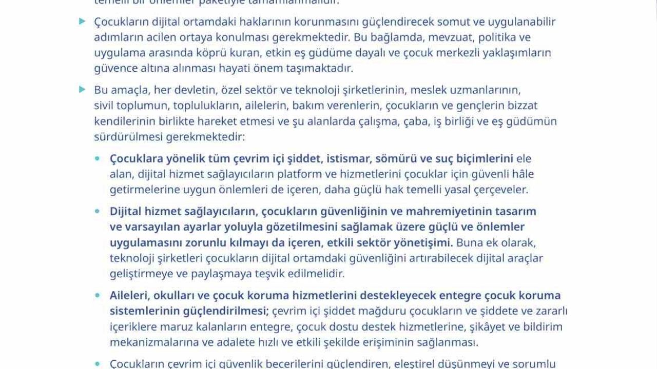 'Çocuklara yönelik tüm çevrim içi şiddet, istismar, sömürü ve suç biçimlerini ele alan, dijital hizmet sağlayıcıların platform ve hizmetlerini çocuklar için güvenli hale getirmelerine uygun önlemleri de içeren, daha güçlü hak temelli yasal çerçeveler. Dijital hizmet sağlayıcıların, çocukların güvenliğinin ve mahremiyetinin tasarım ve varsayılan ayarlar yoluyla gözetilmesini sağlamak üzere güçlü ve önlemler uygulamasını zorunlu kılmayı da içeren, etkili sektör yönetişimi. Buna ek olarak, teknoloji şirketleri çocukların dijital ortamdaki güvenliğini artırabilecek dijital araçlar geliştirmeye ve paylaşmaya teşvik edilmelidir. Aileleri, okulları ve çocuk koruma hizmetlerini destekleyecek entegre çocuk koruma sistemlerinin güçlendirilmesi; çevrim içi şiddet mağduru çocukların ve şiddete ve zararlı içeriklere maruz kalanların entegre, çocuk dostu destek hizmetlerine, şikayet ve bildirim mekanizmalarına ve adalete hızlı ve etkili şekilde erişiminin sağlanması. Çocukların çevrim içi güvenlik becerilerini güçlendiren, eleştirel düşünmeyi ve sorumlu dijital katılımı teşvik eden, aynı zamanda ebeveynlerin, bakım verenlerin, eğitimcilerin ve diğer meslek uzmanlarının kapasitesini geliştiren, genişletilmiş dijital okuryazarlık ve farkındalık artırma çalışmaları. Çocukların çözümün bir parçası olarak dahil edilmesi; güvenli, kapsayıcı ve çocukların gelişen kapasitelerine saygılı katılım yolları sunularak, dijital yaşamlarını etkileyen kararlara anlamlı katılımlarının sağlanması. Özellikle kolluk kuvvetleri, adalet sektörleri ve mağdur desteği bağlamında, bilgi paylaşımını, akranlar arası etkileşim ve eğitimi de içeren uluslararası iş birliği.'
