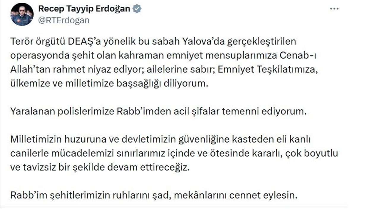 'Terör örgütü DEAŞ'a yönelik bu sabah Yalova'da gerçekleştirilen operasyonda şehit olan kahraman emniyet mensuplarımıza Cenab-ı Allah'tan rahmet niyaz ediyor; ailelerine sabır; Emniyet Teşkilatımıza, ülkemize ve milletimize başsağlığı diliyorum. Yaralanan polislerimize Rabb'imden acil şifalar temenni ediyorum. Milletimizin huzuruna ve devletimizin güvenliğine kasteden eli kanlı canilerle mücadelemizi sınırlarımız içinde ve ötesinde kararlı, çok boyutlu ve tavizsiz bir şekilde devam ettireceğiz. Rabb'im şehitlerimizin ruhlarını şad, mekânlarını cennet eylesin'.