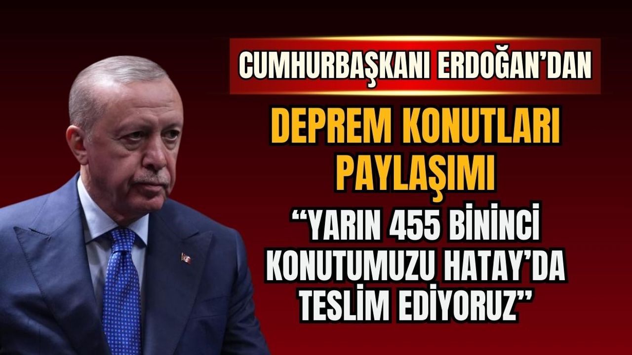 Cumhurbaşkanı Erdoğan, NSosyal hesabından yaptığı açıklamada, "6 Şubat'ta millet olarak çok zor bir imtihanla sınandık. Azimle, sabırla, kararlılıkla çalışarak deprem bölgemizi küllerinden doğan Anka kuşu misali yeniden ayağa kaldırdık. Yarın inşallah 455 bininci konutumuzu Hatay'da teslim ediyoruz. Biz, bir şeyi yapacağız dersek, Allah'ın izniyle yaparız." ifadelerini kullandı.