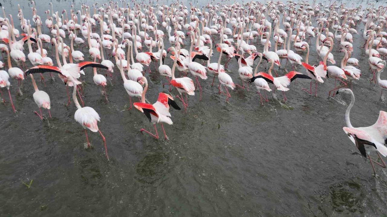Zarif duruşları ve göz alıcı renkleriyle bilinen flamingolar, Eber Gölü'ne gelerek adeta görsel bir şölen başlattı. Gölün sığ sularında beslenen yüzlerce flamingo, bölgeyi pembe ve beyaza bürüdü. Ortaya çıkan bu renkli görüntüler, doğaseverler ve fotoğraf tutkunları için eşsiz kareler sundu.