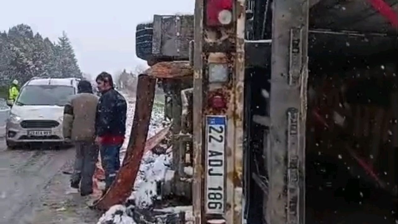 Edirne'de etkili olan kar yağışı ve fırtına nedeniyle yollar kayganlaştı. Tayakadın köyü yolu üzerinde 22 ADJ 186 plakalı yüklü tır, olumsuz hava şartları sebebiyle devrildi.
