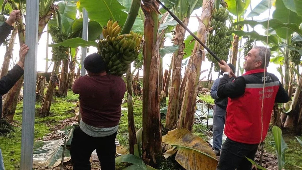 Aydın'ın Efeler ilçesine bağlı Dalama Mahallesi'nde muz hasadı gerçekleştirildi. Efeler İlçe Tarım ve Orman Müdürlüğü'nün de katıldığı hasat programında, üretici Hakan Özer'in muz bahçesi ziyaret edildi. Yaklaşık 5 yıldır 4 dekar alanda muz yetiştiriciliği yapan Hakan Özer'in bahçesinde 700 adet muz ağacı bulunurken, Özer normal şartlarda sezonda 26-27 ton civarında muz üretimi gerçekleştiriyor. Hasada katılan Efeler İlçe Tarım ve Orman Müdürü Mehmet Esen de üreticiyle birlikte muzları hasat ederken, bereketli bir yıl temennisinde bulundu.