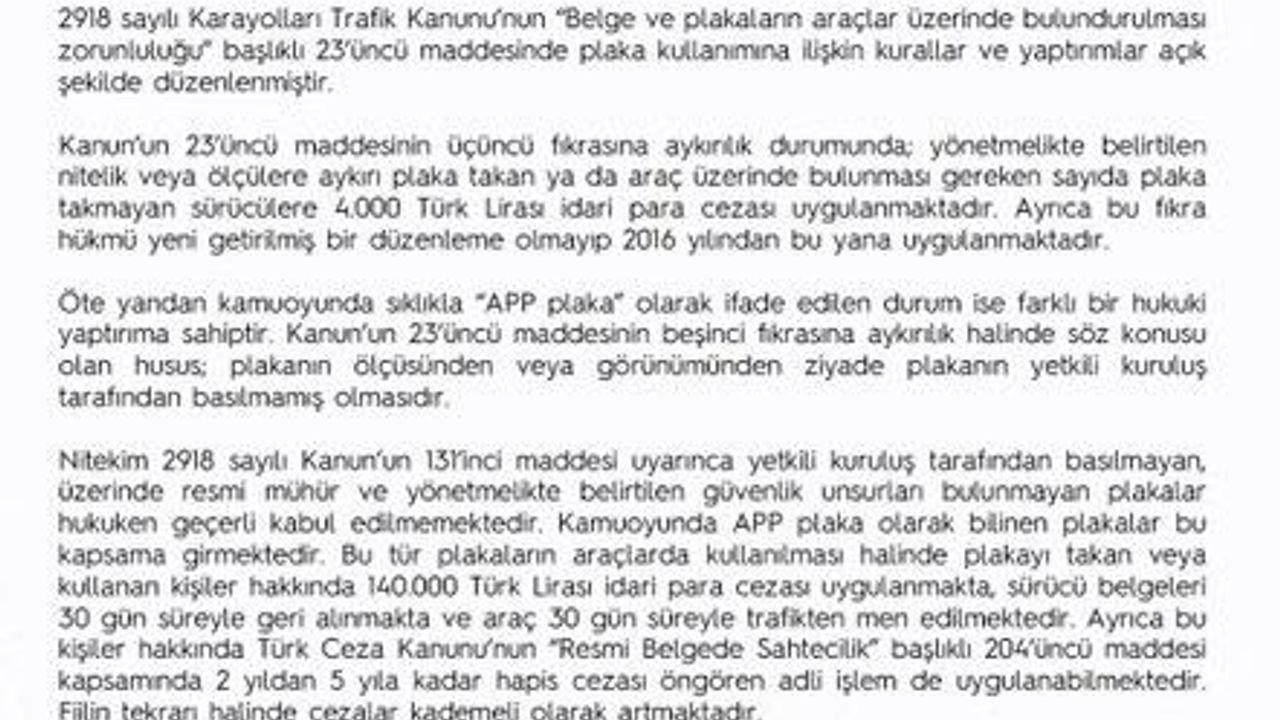 APP plaka olarak ifade edilen durumun farklı bir hukuki yaptırıma sahip olduğu belirtilen açıklamada, 'Öte yandan kamuoyunda sıklıkla 'APP plaka' olarak ifade edilen durum ise farklı bir hukuki yaptırıma sahiptir. Kanun'un 23'üncü maddesinin beşinci fıkrasına aykırılık halinde söz konusu olan husus; plakanın ölçüsünden veya görünümünden ziyade plakanın yetkili kuruluş tarafından basılmamış olmasıdır. Nitekim 2918 sayılı Kanun'un 131'inci maddesi uyarınca yetkili kuruluş tarafından basılmayan, üzerinde resmi mühür ve yönetmelikte belirtilen güvenlik unsurları bulunmayan plakalar hukuken geçerli kabul edilmemektedir. Kamuoyunda APP plaka olarak bilinen plakalar bu kapsama girmektedir. Bu tür plakaların araçlarda kullanılması halinde plakayı takan veya kullanan kişiler hakkında 140 bin lira idari para cezası uygulanmakta, sürücü belgeleri 30 gün süreyle geri alınmakta ve araç 30 gün süreyle trafikten men edilmektedir. Ayrıca bu kişiler hakkında Türk Ceza Kanunu'nun 'Resmi Belgede Sahtecilik' başlıklı 204'üncü maddesi kapsamında 2 yıldan 5 yıla kadar hapis cezası öngören adli işlem de uygulanabilmektedir. Fiilin tekrarı halinde cezalar kademeli olarak artmaktadır' ifadelerine yer verildi.