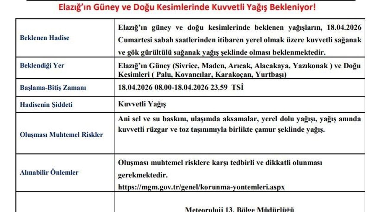 Meteoroloji 13. Bölge Müdürlüğü'nden yapılan açıklamada, 'Elazığ'ın güney ve doğu kesimlerinde beklenen yağışların, 18.04.2026 Cumartesi sabah saatlerinden itibaren yerel olmak üzere kuvvetli sağanak ve gök gürültülü sağanak yağış şeklinde olması beklenmektedir. Beklendiği yer Elazığ'ın güney (Sivrice, Maden, Arıcak, Alacakaya, Yazıkonak ) ve doğu kesimleridir ( Palu, Kovancılar, Karakoçan, Yurtbaşı). Oluşması muhtemel riskler; ani sel ve su baskını, ulaşımda aksamalar, yerel dolu yağışı, yağış anında kuvvetli rüzgar ve toz taşınımıyla birlikte çamur şeklinde yağıştır. Oluşması muhtemel risklere karşı tedbirli ve dikkatli olunması gerekmektedir' denildi.