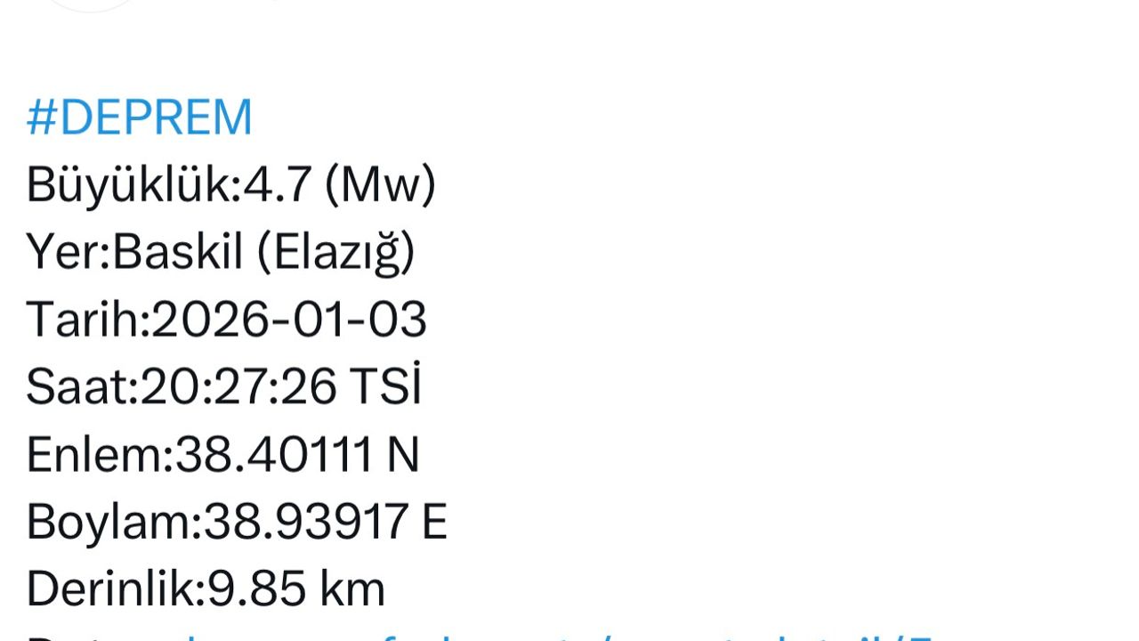 Afet ve Acil Durum Yönetimi Başkanlığı Deprem Dairesi Başkanlığından alınan bilgiye göre, saat 20.27'de merkez üssü Elazığ'ın Baskil ilçesinde 4.7 büyüklüğünde deprem meydana geldi. Yerin yaklaşık 10 kilometre derinliğinde meydana gelen depremle ilgili olumsuz bir durum yaşanmadığı öğrenildi.