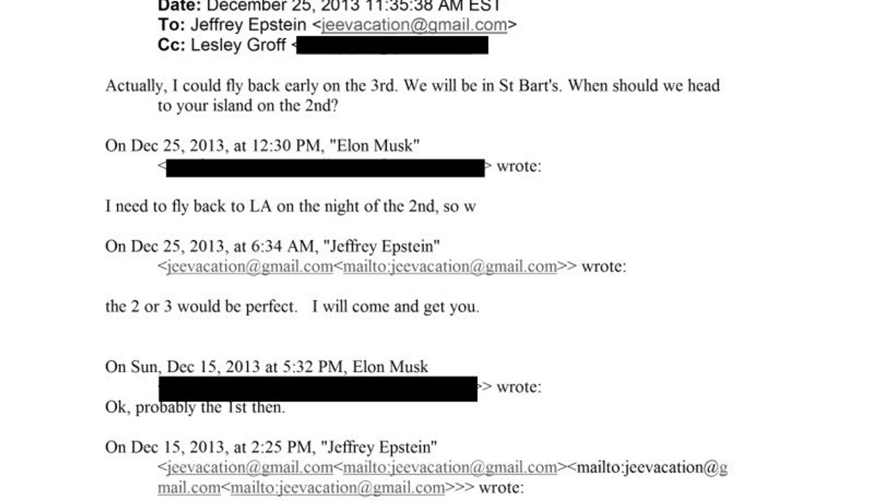 Yeni paylaşılan başka bir e-postada ise 2013 yılında milyarder iş insanı Elon Musk'ın Epstein'e Karayipler'deki adaya ne zaman gideceklerini sorduğu ortaya çıktı. Daha önceki açıklamalarında Epstein'in sahibi olduğu iki adadan birine gelmesi için yaptığı davetleri reddettiğini ileri süren Musk'ın 13 Aralık 2013 tarihli bir e-postada Epstein'e, 'Tatilde İngiltere Virjin Adaları yakınlarında Saint Barthelemy Adası'nda olacağım. Ne zaman müsait olursun?' diye yazdığı görüldü.