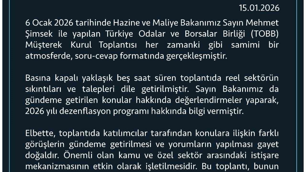 '6 Ocak tarihinde Hazine ve Maliye Bakanımız Mehmet Şimşek ile yapılan Türkiye Odalar ve Borsalar Birliği (TOBB) Müşterek Kurul Toplantısı her zamanki gibi samimi bir atmosferde, soru-cevap formatında gerçekleşmiştir. Basına kapalı yaklaşık 5 saat süren toplantıda reel sektörün sıkıntıları ve talepleri dile getirilmiştir. Bakanımız da gündeme getirilen konular hakkında değerlendirmeler yaparak, 2026 yılı dezenflasyon programı hakkında bilgi vermiştir. Elbette, toplantıda katılımcılar tarafından konulara ilişkin farklı görüşlerin gündeme getirilmesi ve yorumların yapılması gayet doğaldır. Önemli olan kamu ve özel sektör arasındaki istişare mekanizmasının etkin olarak işletilmesidir. Bu toplantı, bunun güzel bir örneği olmuştur.'