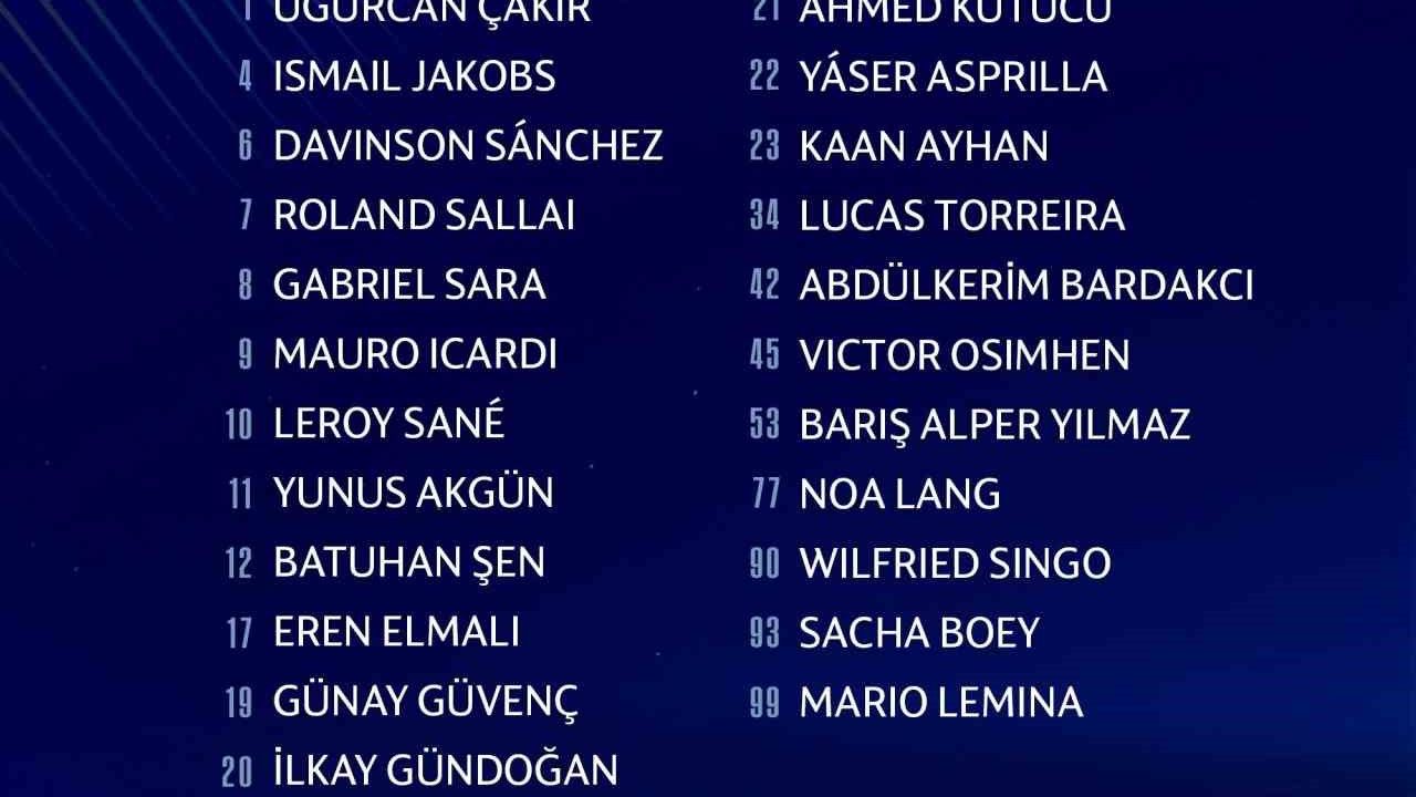'Uğurcan Çakır, Ismail Jakobs, Davinson Sanchez, Roland Sallai, Gabriel Sara, Mauro Icardi, Leroy Sane, Yunus Akgün, Batuhan Şen, Eren Elmalı, Günay Güvenç, İlkay Gündoğan, Ahmed Kutucu, Yaser Asprilla, Kaan Ayhan, Lucas Torreira, Abdülkerim Bardakcı, Victor Osimhen, Barış Alper Yılmaz, Noa Lang, Wilfried Singo, Sacha Boey ve Mario Lemina.'