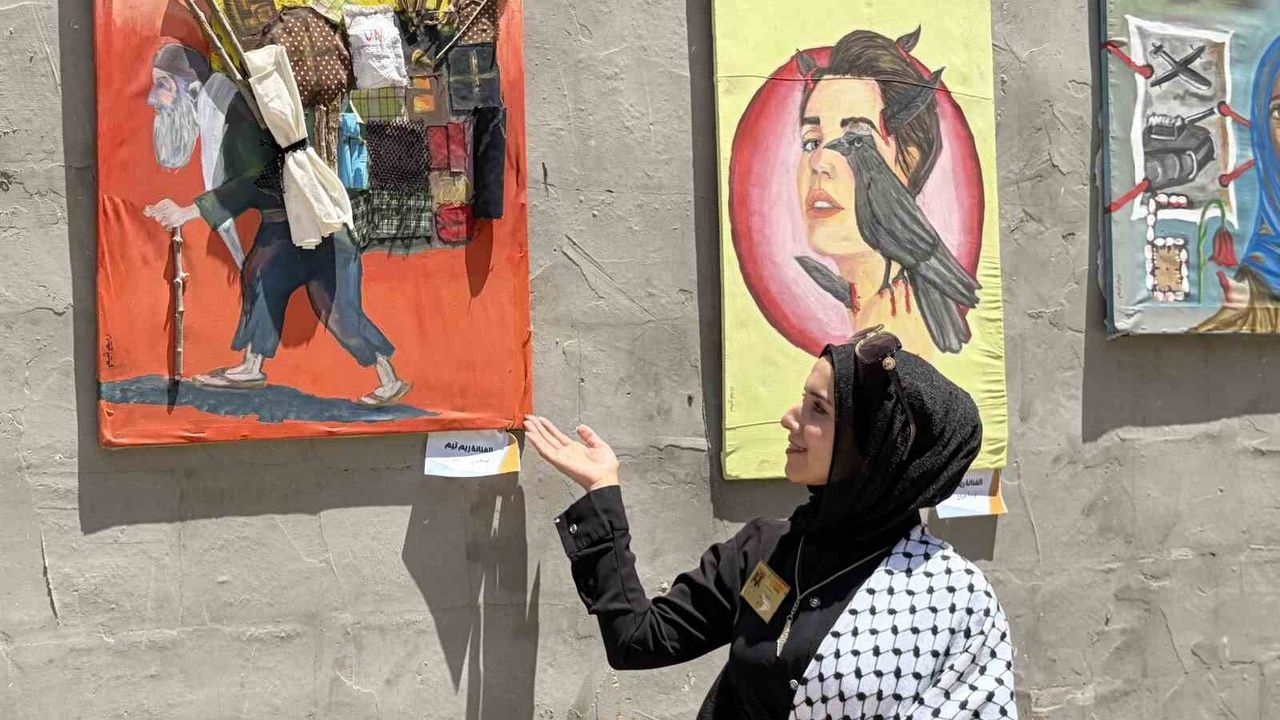 Filistinli 64 sanatçı, Gazze Şeridi'nde düzenlenen sergide İsrail saldırılarının yol açtığı acı, yıkım ve kayıpları eserleriyle gözler önüne serdi.