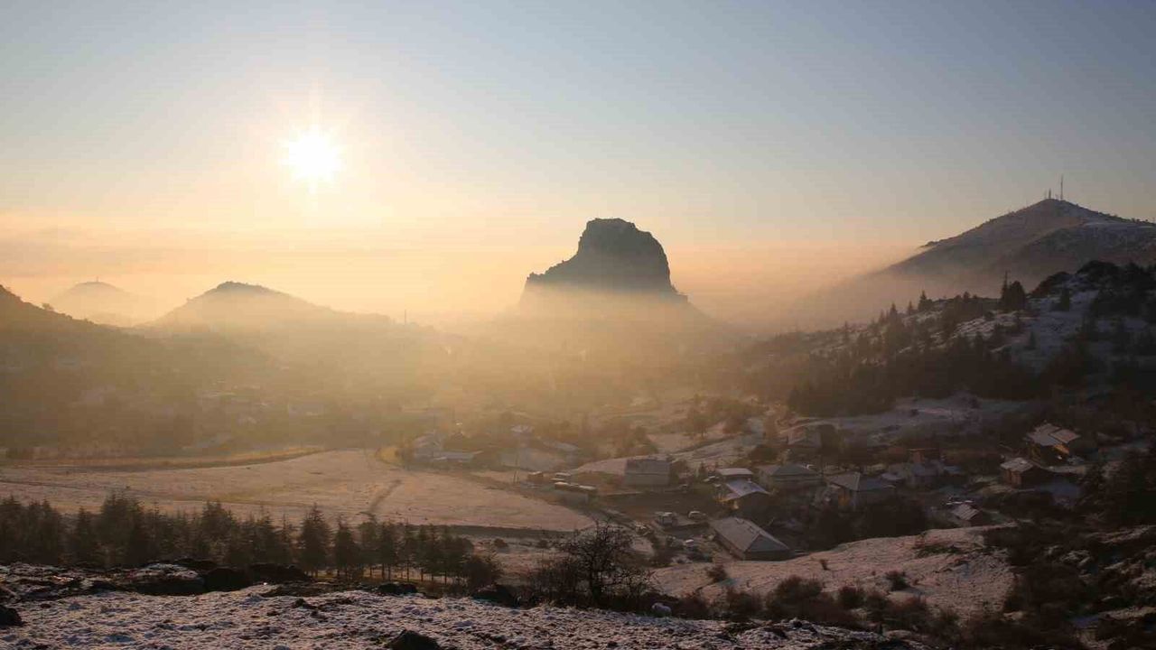 Afyonkarahisar'ın simgesi tarihi Karahisar Kalesi'nin gün doğumu ile birlikte çekilen sis altındaki görüntüsü görenleri kendisine hayran bıraktı.
