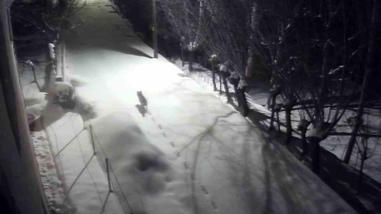 Sert kış şartları nedeniyle kırsalda besin bulmakta güçlük çekip şehir merkezine inen kurtlar, bir evin güvenlik kamerasına yansıdı.