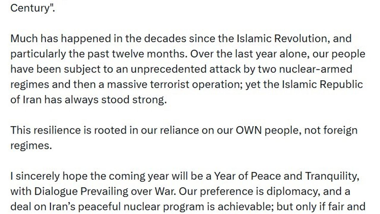 İran Dışişleri Bakanı Abbas Arakçi, İslam Devrimi'nin 47'nci yıldönümünün coşkuyla kutlandığını belirterek, 'Gelecek yılın, savaşın yerine diyaloğun galip geldiği bir barış ve huzur yılı olmasını içtenlikle umuyorum. Tercihimiz diplomasidir ve İran'ın barışçıl nükleer programı konusunda bir anlaşmaya varılabilir. Ancak bu anlaşma sadece adil ve dengeli olduğu takdirde mümkündür. İran, bedeli ne olursa olsun bu uğurda egemenliğini savunmaktan çekinmeyecektir' açıklamasında bulundu.