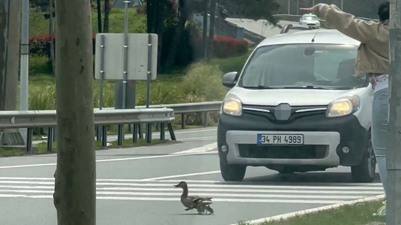 İstanbul'da bir ördek ailesinin karşıdan karşıya geçmesi için duyarlı bir sürücü akan trafiği durdurdu. O anlar trafikteki başka bir vatandaşın kamerasına yansıdı.