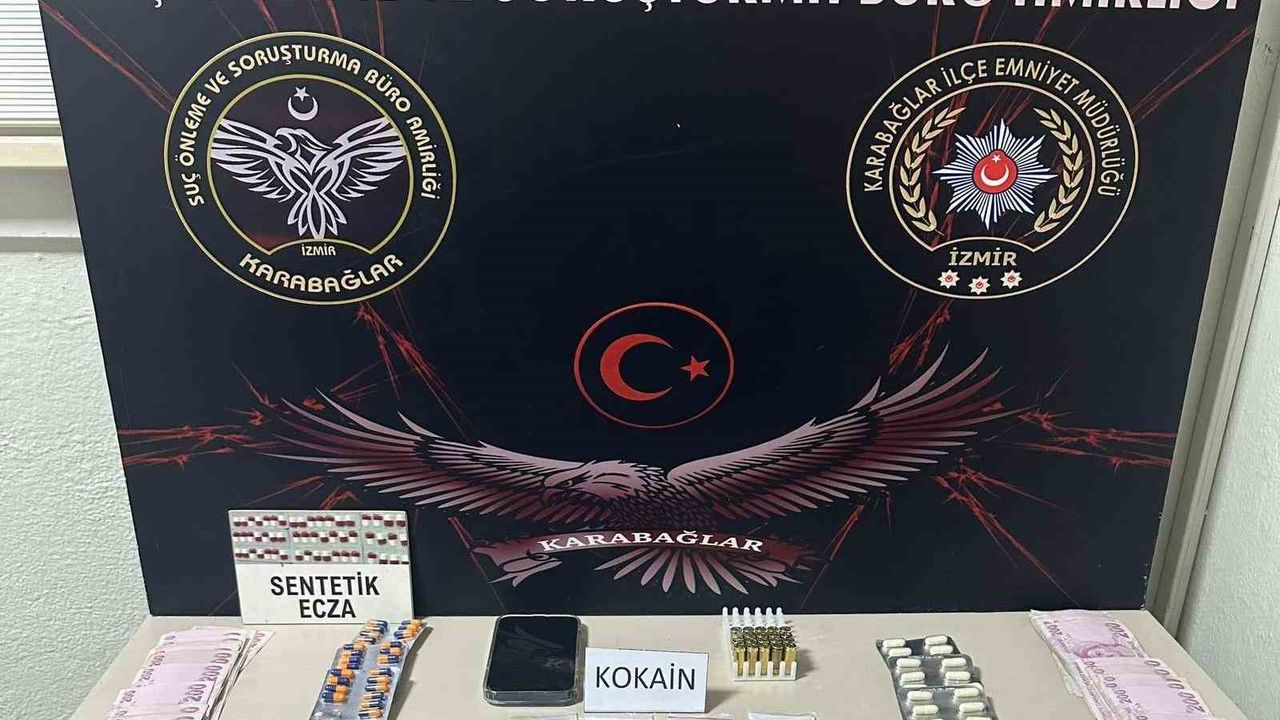 Edinilen bilgiye göre, Karabağlar İlçe Emniyet Müdürlüğü ekipleri, uyuşturucu madde ticareti ile mücadele çalışmaları kapsamında U.T. (35) ve kız arkadaşı B.I.'yı (32) takibe aldı. Yapılan takip sonucu harekete geçen ekipler, şüphelilerin bulunduğu aracı durdurdu. Araçta yapılan detaylı aramada; 18 parça halinde paketlenerek sokak satışı için hazır hale getirilmiş toplam 92,20 gram kokain, 67 adet uyuşturucu hap, 4,90 gram esrar maddesi, 1 adet hassas terazi, 25 adet tabanca fişeği ve suçtan elde edildiği değerlendirilen 7 bin 800 TL nakit para ele geçirildi. Olayla ilgili gözaltına alınan U.T. ve B.I. hakkında 'Uyuşturucu veya uyarıcı madde ticareti yapmak' suçundan adli işlem başlatıldı. Emniyetteki işlemleri tamamlanan şüphelilerin bugün adliyeye sevk edileceği öğrenildi.