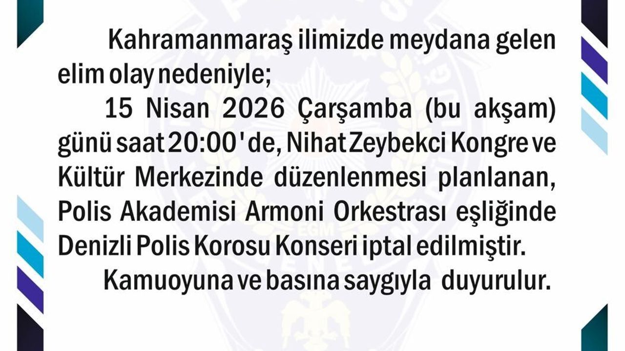 Denizli Emniyet Müdürlüğü'nden yapılan yazılı açıklamada, sanatseverlerin ve vatandaşların katılımıyla gerçekleştirilmesi beklenen etkinlik alınan iptal kararı kamuoyuyla paylaşıldı. Yapılan resmi duyuruda, 15 Nisan 2026 Çarşamba günü (bugün) saat 20.00'de Nihat Zeybekci Kongre ve Kültür Merkezi'nde, Polis Akademisi Armoni Orkestrası eşliğinde düzenlenmesi planlanan Denizli Polis Korosu konserinin, Kahramanmaraş'ta yaşanan üzücü olay sebebiyle yapılmayacağı belirtildi.
