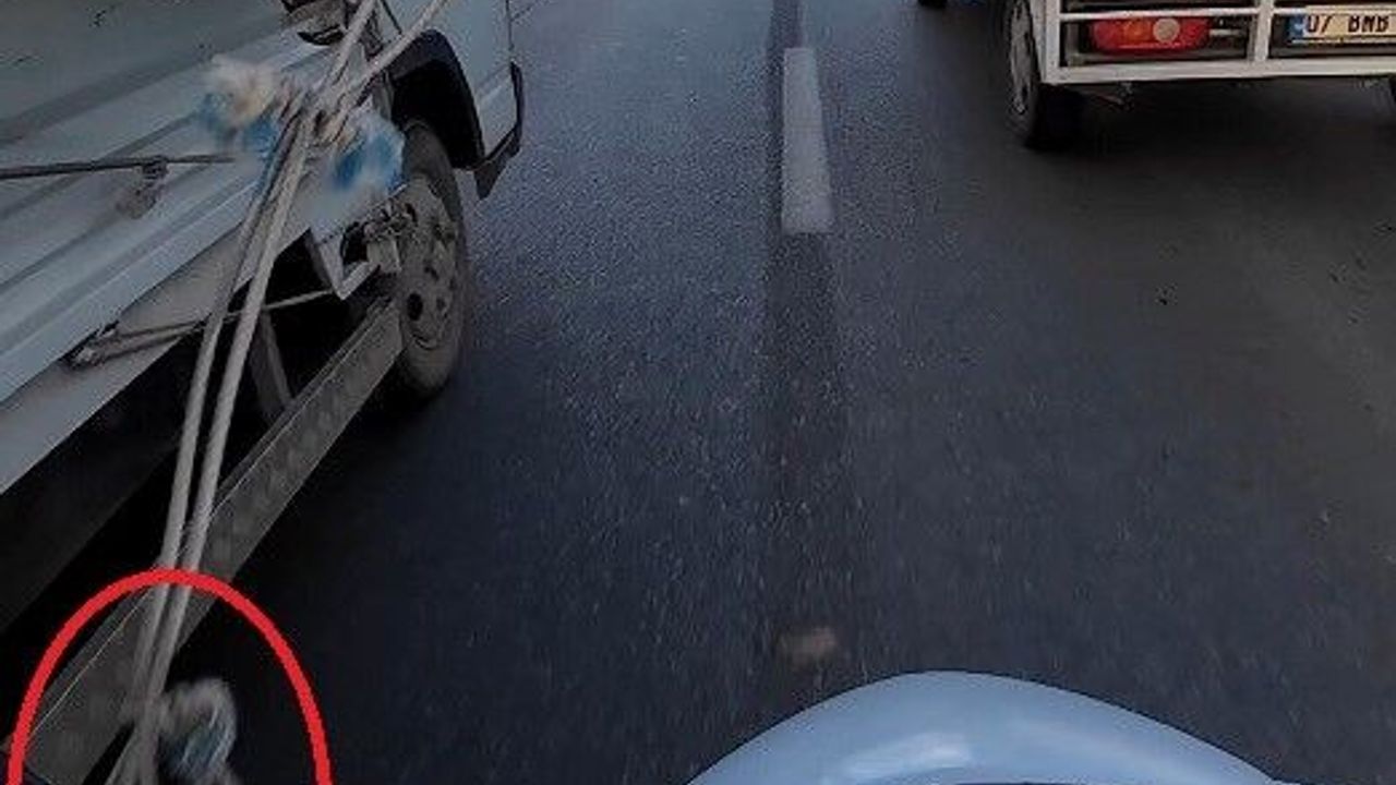 Antalya'da iki kamyonet arasından geçmeye çalışan motokurye, sarkan branda ipine takılarak yola savruldu. Kamyonet tekerlerinin altında kalmaktan son anda kurtulan motosikletlinin ölümle burun buruna geldiği anlar, kask kamerasına saniye saniye yansıdı.