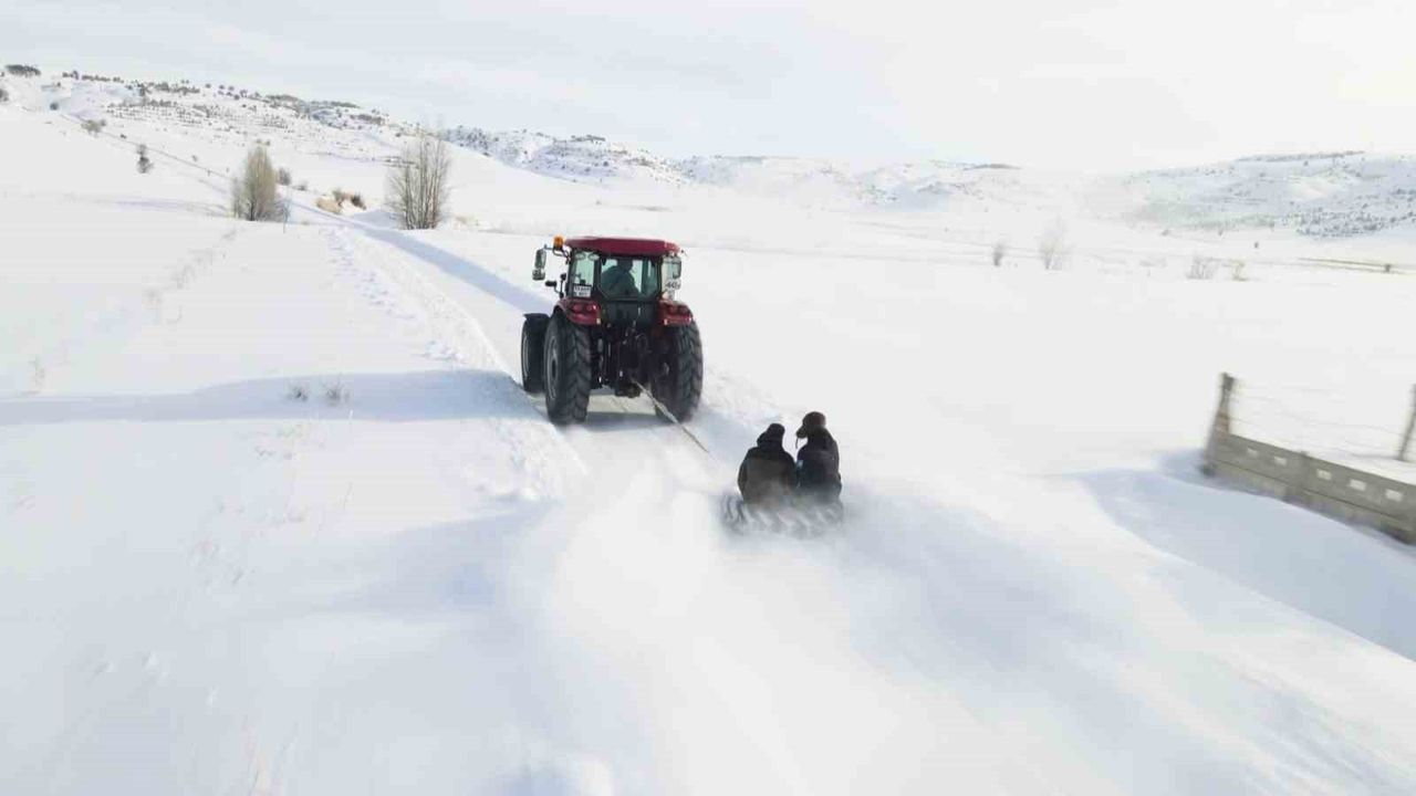 Sivas'ta yoğun kar yağışını eğlenceye dönüştüren bir vatandaş, traktöre bağladığı lastikle köy sokaklarında kayarak gezdi. O anlar aksiyon kamerası ve dron ile kaydedilirken, ortaya renkli görüntüler çıktı.